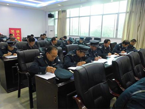 “保安員證”考試中,隊(duì)員正在聚精會(huì)神參加筆試